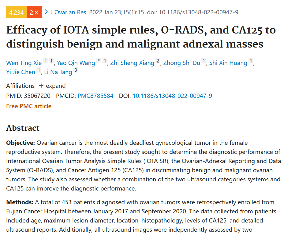 近期,我院超声科谢文婷医师/王瑶琴副主任医师为第一作者,唐丽娜主任医师为通讯作者在国际医学杂志《Journal of Ovarian Research》上发表论文“Efficacy of IOTA simple rules, O-RADS, and CA125 to distinguish benign and malignant adnexal masses”。该研究基于国际卵巢肿瘤研究组织制定的IOTA简易法则(International Ovarian Tumor Analysis)及北美放射学会制定的卵巢-附件报告和数据系统超声分层和管理系统O-RADS(Ovarian-Adnexal Reporting and Data System),分析我院诊治的卵巢肿瘤患者术前超声图像,结合术前CA125检测指标,探索两种模型在卵巢肿瘤良恶性鉴别诊断中的价值研究。