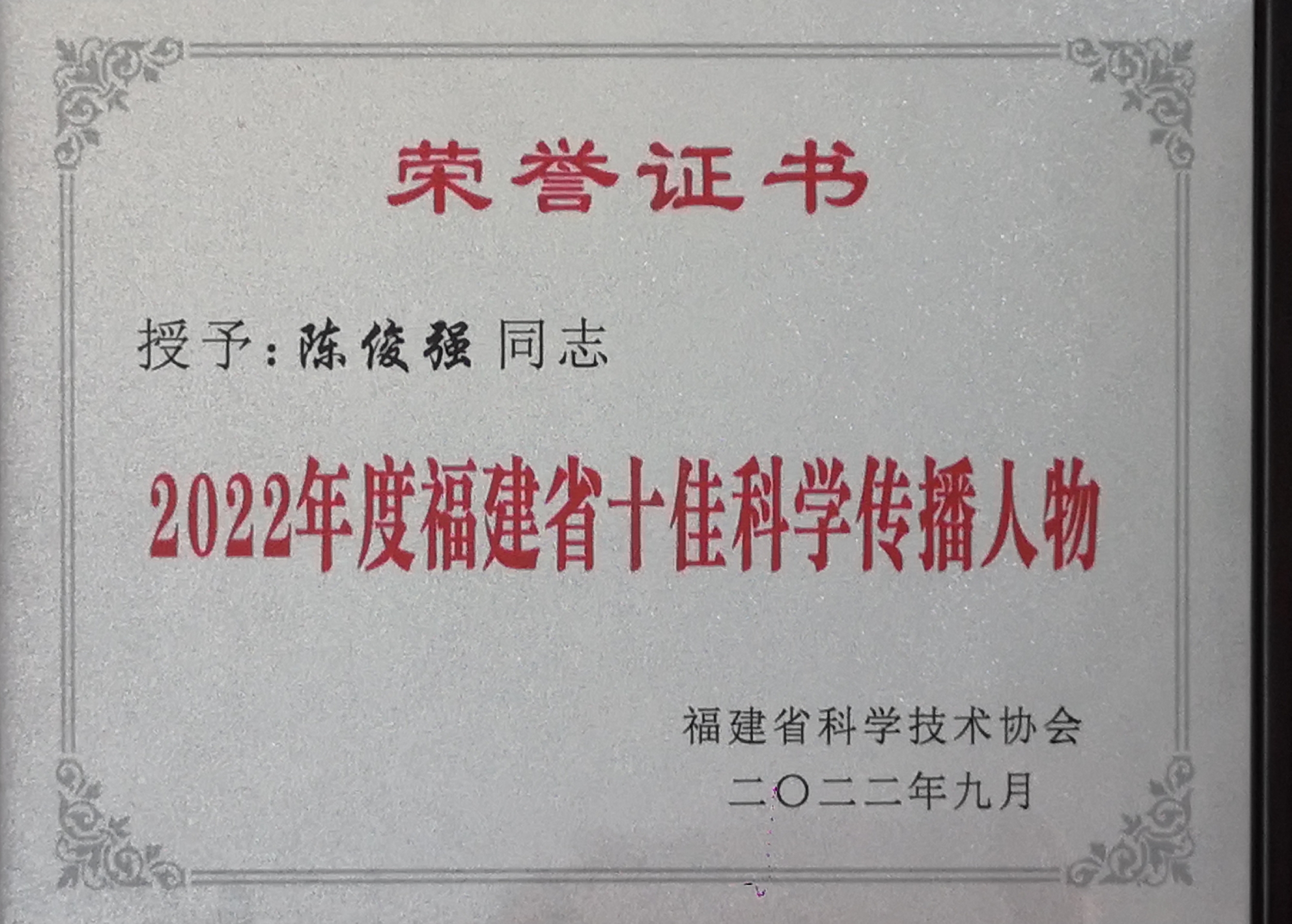 9月14日,在2022年全国科普日福建省主场活动上,举行了“典赞·2022福建科普”发布仪式,正式发布了年度十佳科学传播人物、年度十佳科普教育基地、年度十佳科技辅导员。我院18区特需病房陈俊强教授被评为“2022年度福建省十佳科学传播人物”。