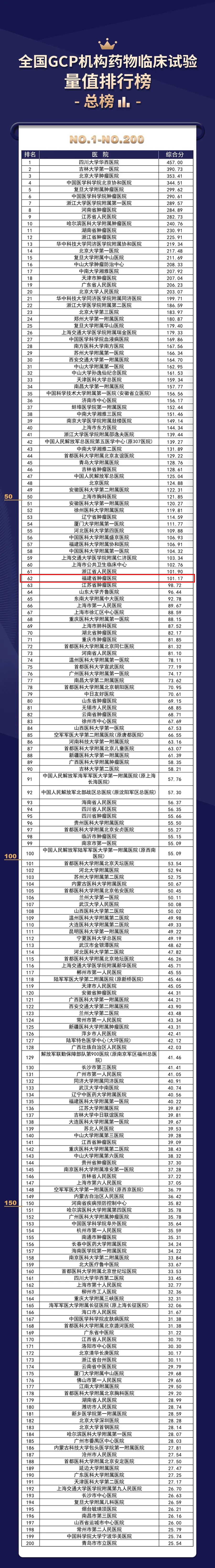 日前,《全国GCP机构药物临床试验量值排行榜》发布。在反映药物临床试验整体水平的《总榜》中,我院位居全国所有医院第62位,全国肿瘤专科医院第12位,福建省第3位,在业内排名居全国前列,成绩斐然。