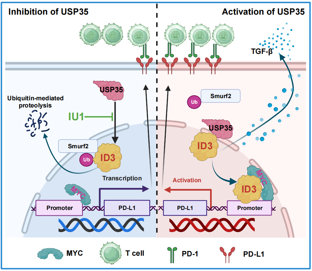 该研究基于前期发现分化抑制因子ID3通过重构MYC促进PD-L1表达的分子机制,进一步通过去泛素化酶文库筛选,鉴定出USP35可通过去泛素化修饰维持ID3蛋白稳定性,从而促进结直肠癌免疫逃逸。在此基础上,筛选出小分子抑制剂IU1,其通过抑制USP35对ID3的去泛素化作用,增强PD-L1的降解,进而恢复T细胞功能,有效抑制肠癌免疫逃逸。此外,研究团队还发现鞘脂代谢可能在IU1抑制肠癌免疫逃逸的过程中发挥重要作用。该研究为结直肠癌患者的个体化治疗提供了重要的理论依据与临床参考价值。